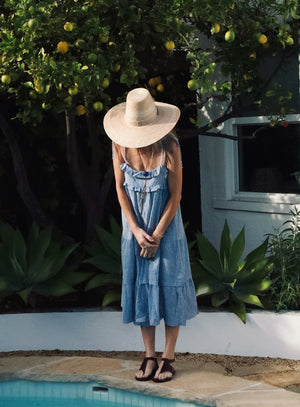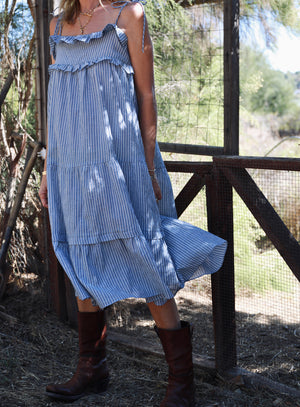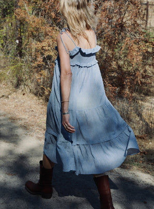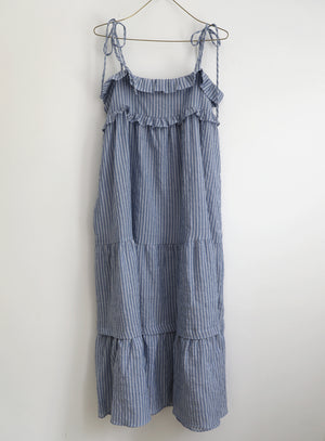 Delicate ruffled & tiered dress - ties at the shoulders. Easy, roomy, a-line fit. Pulls over. 100% Cotton. Made in California. Wash cold, line dry.