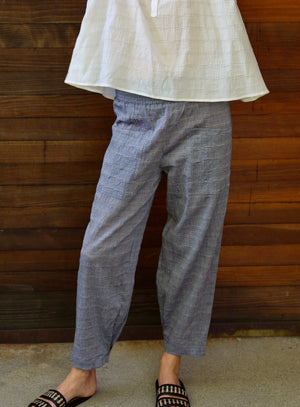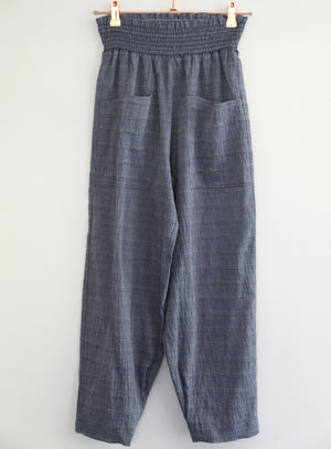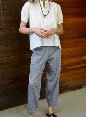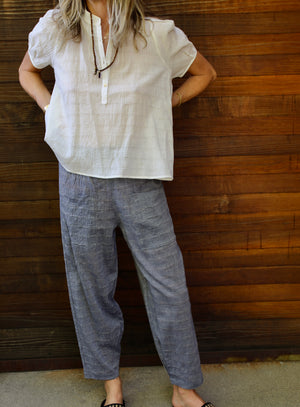 Crafted in cotton voile, our easy-fitting pant features a smocked waistband, pleated cuffs, and patch pockets. Textured stripe detail running through the fabric. 100% Cotton. Wash cold, line dry or tumble dry low heat. Made in California.
