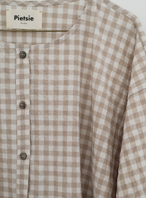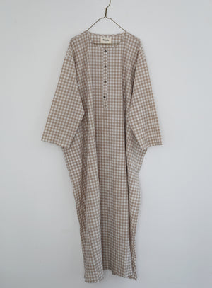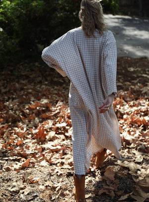 The Tunis Caftan has a wide fit, deep placket and pockets. Vintage shell buttons. Pulls over. 100% Cotton. Wash cold, line dry. Made in California.