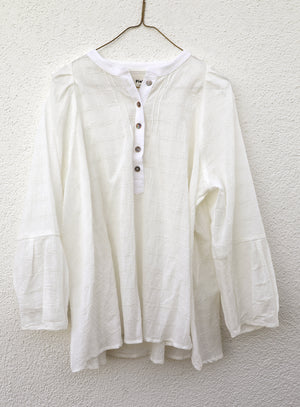 The Atlin Top has pleats at the shoulders, balloon sleeves, shirred cuffs and a roomy a-line cut. Vintage shell buttons, french seam construction, pulls over. 100% cotton. Wash cold, line dry. Made in California. Fi is wearing a size extra small.