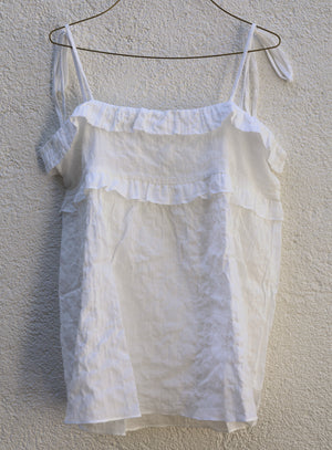 Ruffled a-line top with adjustable tie straps. Pulls over. 100% Japanese Herringbone Cotton. Wash delicate, line dry. Made in California.