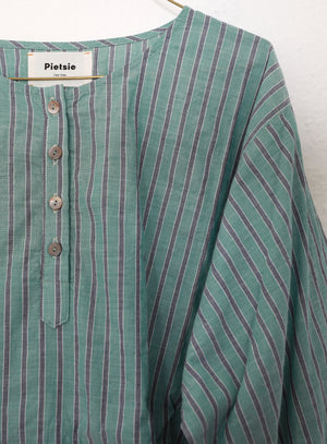 Oversized top with buttoned half-placket and long wide sleeves. Vintage shell buttons. Pulls over. One size fits most. 100% Organic Japanese Cotton. Wash cold, line dry. Made in California.