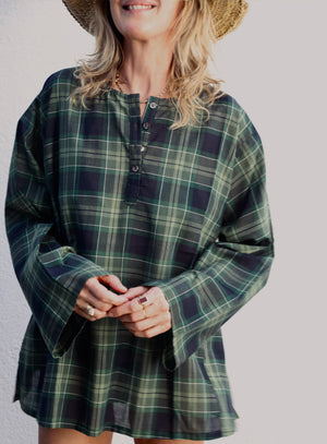 Oversized top with buttoned half-placket and long wide sleeves. Vintage shell buttons. Pulls over. One size fits most. 100% Japanese Paper Cotton. Wash cold, line dry. Made in California.