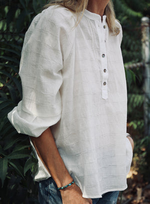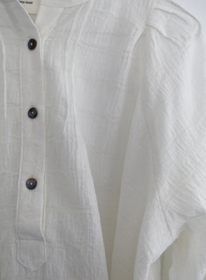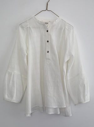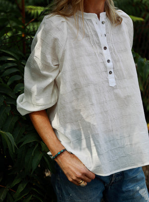 The Atlin Top has pleats at the shoulders, balloon sleeves, shirred cuffs and a roomy a-line cut. Vintage shell buttons, french seam construction, pulls over. 100% cotton. Wash cold, line dry. Made in California. Fi is wearing a size extra small.
