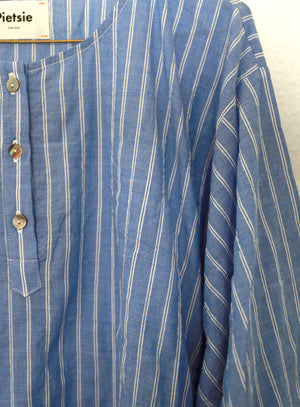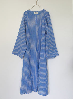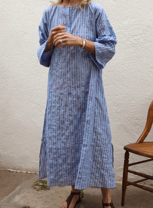 Roomy caftan in puckered Japanese shirting fabric. Long wide sleeves and a notched hem. Narrower fit than our Tunis Caftan. Vintage shell buttons. French seam construction. Pulls over. 100% Organic Cotton. Wash cold, line dry. Made in California.