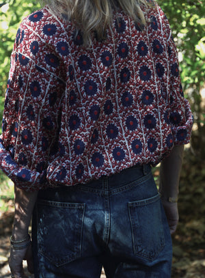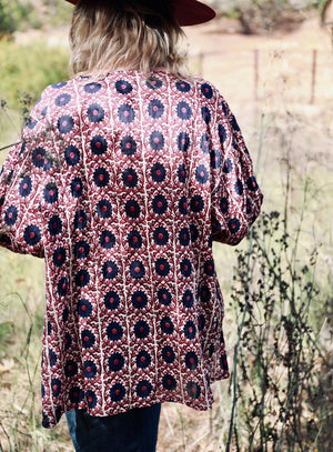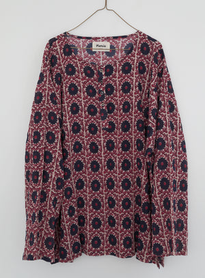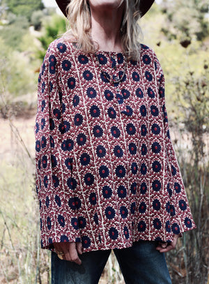 Oversized top with buttoned half-placket and long wide sleeves. Vintage shell buttons. Pulls over. One size fits most. 100% Cotton. Wash cold, line dry. Made in California.