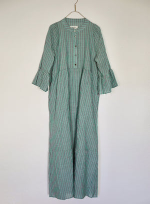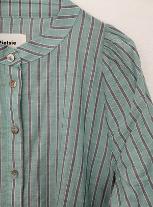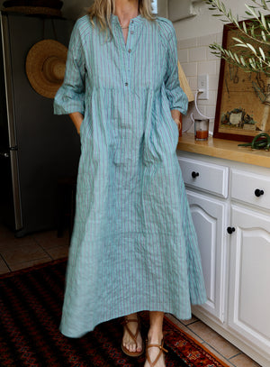 Our newest style for spring - made in beautiful Japanese shirting fabric with a slight puckered hand. Deep tiered hem, band collar, bell sleeves and a vintage shell button placket. Roomy fit. Pockets. Pulls over. 100% Organic Cotton. Made in California. Wash cold, line dry. Runs big, we recommend sizing down from your regular size.
