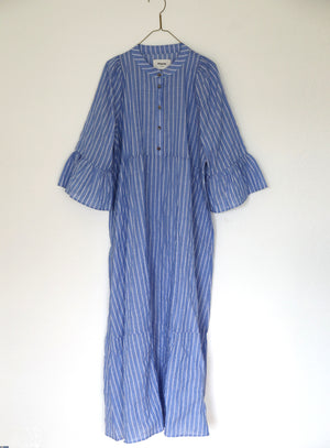 Our newest style for spring - made in beautiful Japanese shirting fabric with a slight puckered hand. Deep tiered hem, band collar, bell sleeves and a vintage shell button placket. Roomy fit. Pockets. Pulls over. 100% Organic Cotton. Made in California. Wash cold, line dry.