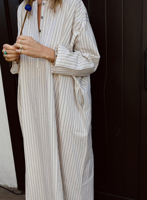 Our OG caftan in crisp Japanese organic cotton. 3/4 length sleeves and pockets. Wider fit than our Bal Caftan. Vintage shell buttons on a deep placket. French seam construction. Notched hem. Pulls over. 100% Organic Craft Washer Cotton. Wash cold, line dry. Made in California.